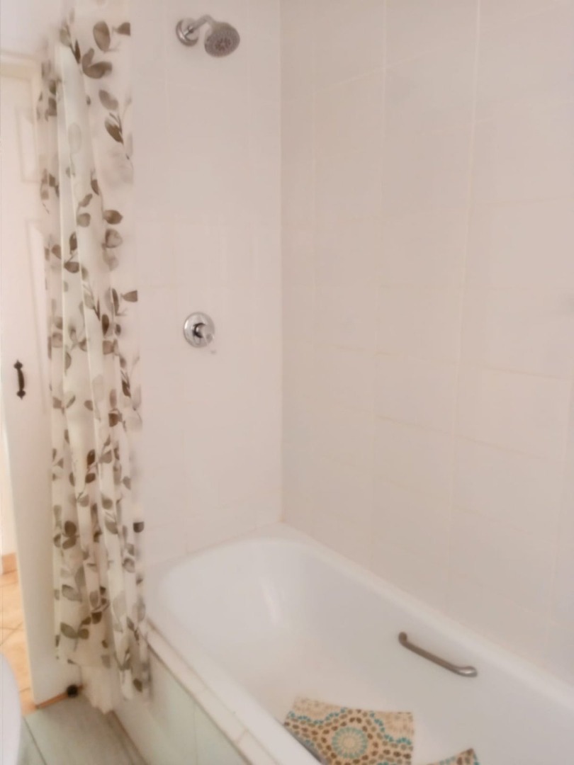 A Tiled Bathroom with Bath, Shower and Toilet with Blinds, add to the luxury of this unit, as well as an additional toilet for guests.